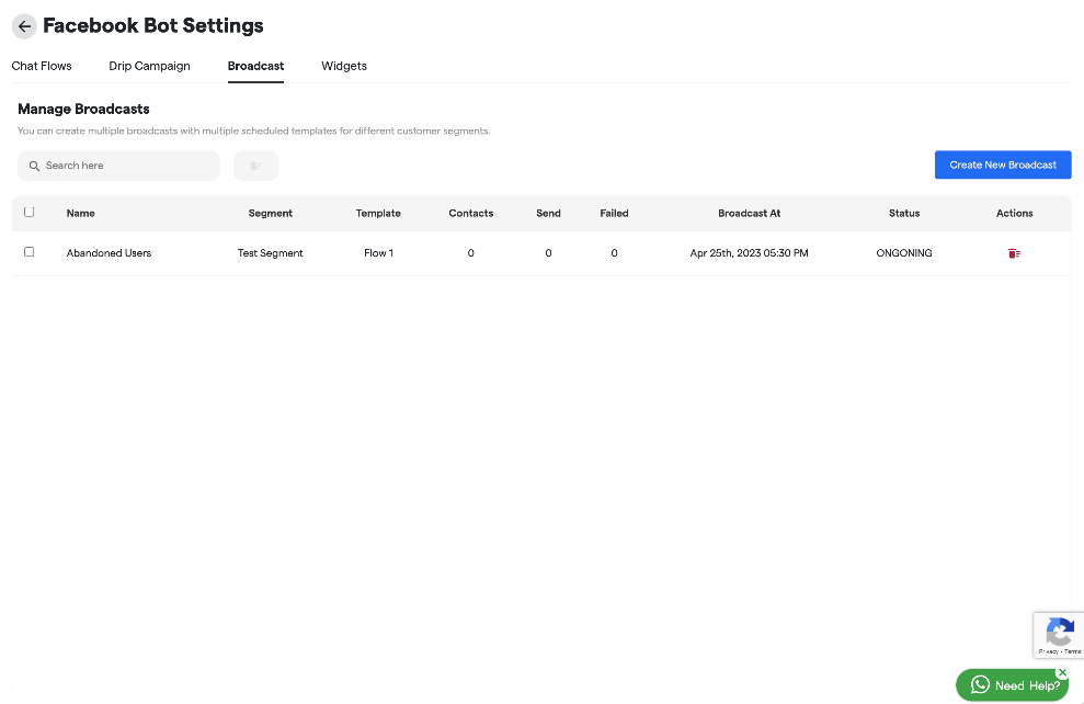 Users will be able to create Facebook broadcast (message blast) campaigns which will allow them to send bulk messages in one go to their contact segments. Users will also be able to schedule these broadcast campaigns.